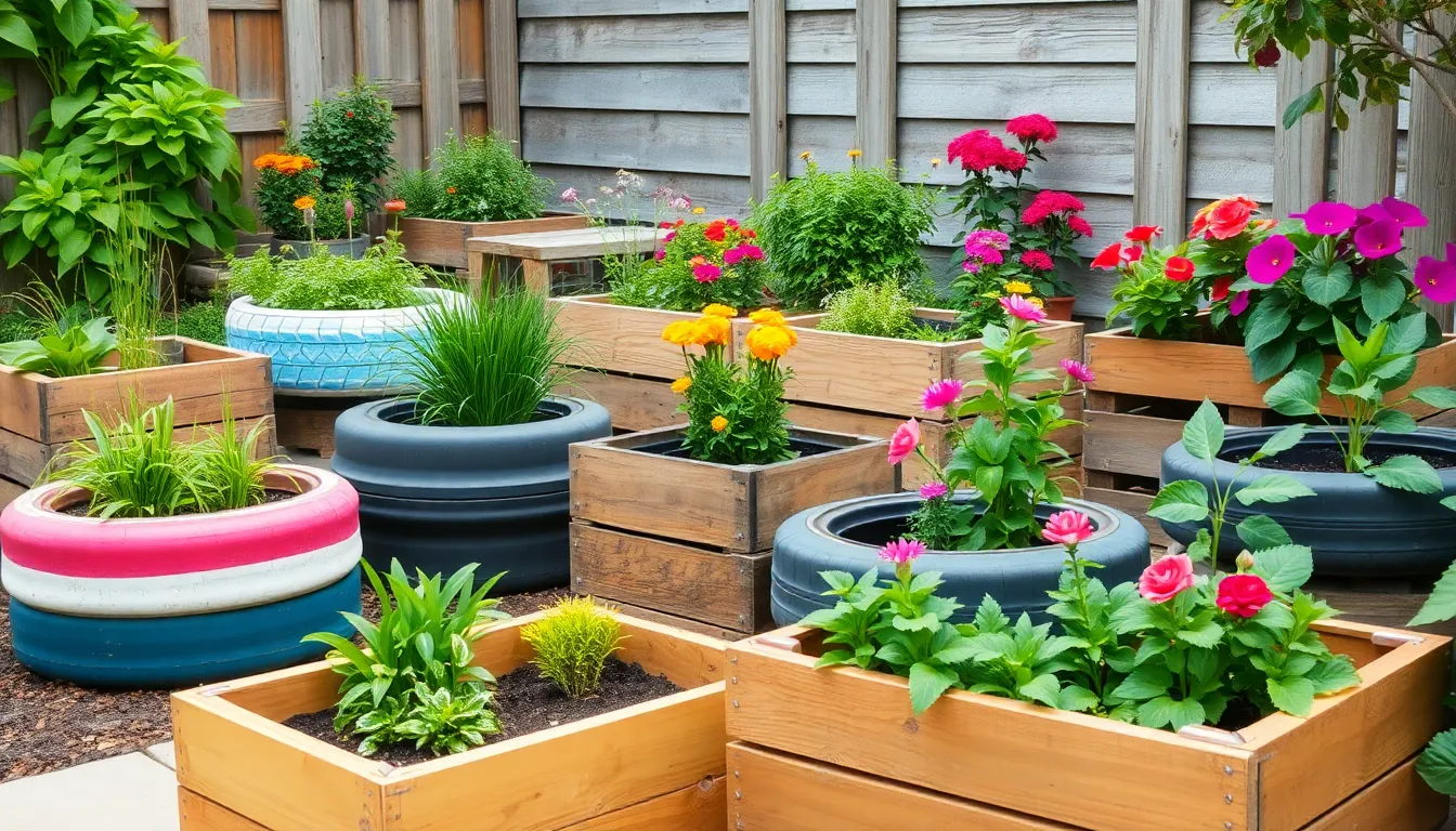 Reclaimed wood serves as an excellent resource for making planter boxes. Wooden pallets can transform into creative vertical gardens that save space. Old tires, when painted, create colorful and whimsical planters. Additionally, wine barrels offer a rustic option for growing flowers or vegetables. Using broken pottery in a mosaic pattern adds artistic flair to garden beds. Each of these materials reduces waste while enhancing aesthetic appeal.